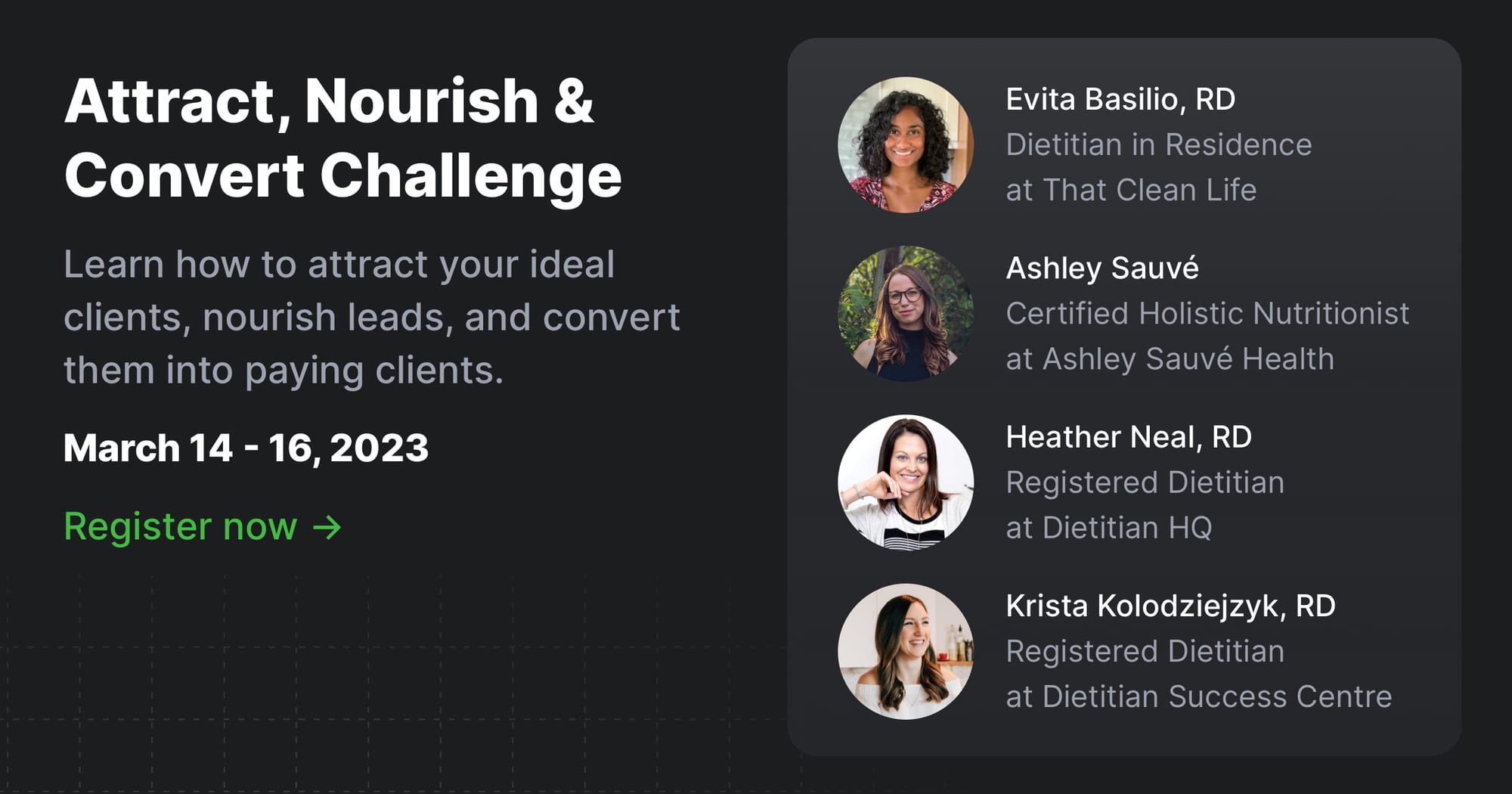 To learn more about nurturing nutrition leads and converting them into clients, check out the next two expert-led talks with dietitians Heather Neal and Krista Kolodziejzyk in our Attract, Nourish & Convert Challenge.
