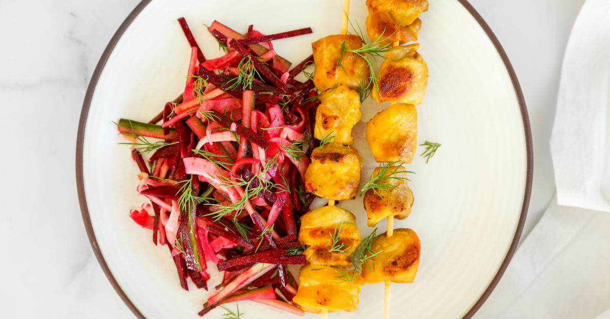 This flavorful dish supports heart health with monounsaturated fats from chicken thighs and extra virgin olive oil, while potassium-rich ingredients help regulate blood pressure. The crisp cucumber, beet, and fennel salad adds fiber for better digestion and sustained fullness. Packed with immune-boosting vitamins A and C, this meal strengthens the body’s natural defenses while keeping things light, colorful, and satisfying.