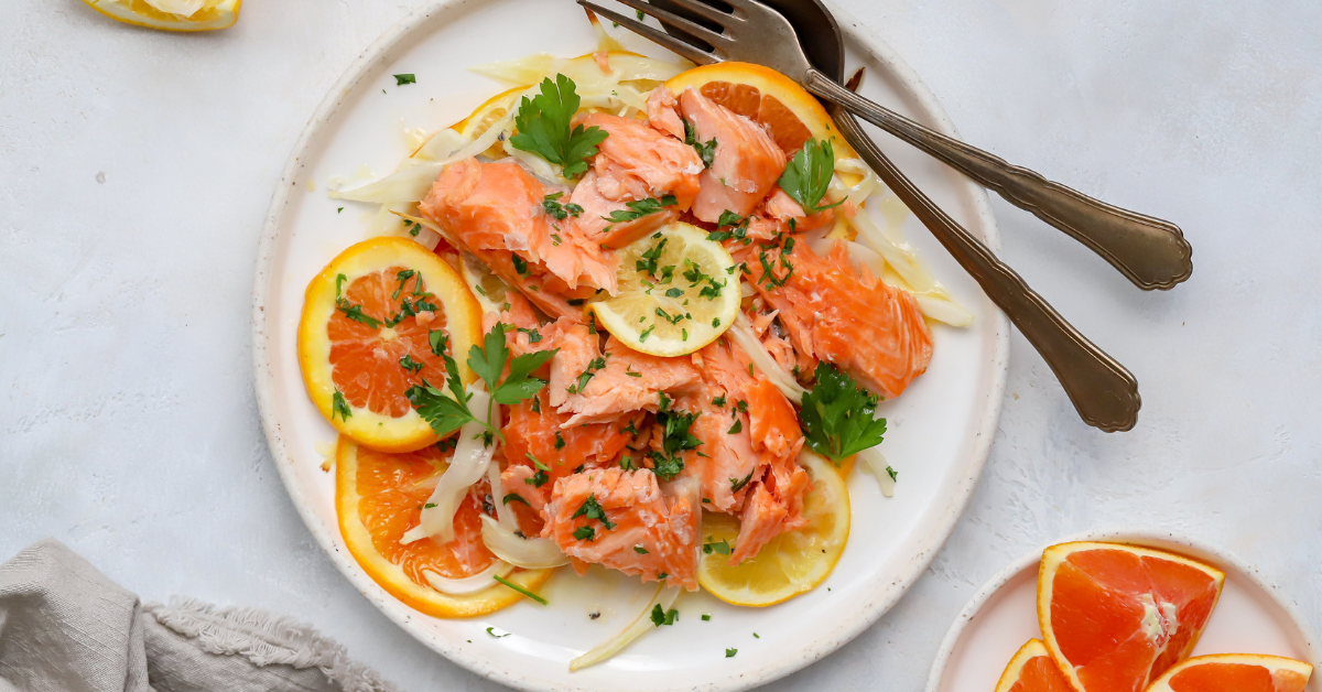 This bright and flavorful dish is packed with heart-healthy omega-3s from salmon and monounsaturated fats from olive oil, helping to reduce inflammation and support healthy cholesterol levels. With vitamin D from salmon and vitamin K from parsley, it also promotes strong bones and optimal calcium absorption. The citrusy burst from navel orange and lemon adds a generous dose of immune-boosting vitamin C, along with other essential nutrients like vitamin A, vitamin E, and zinc—making this meal as nourishing as it is delicious.