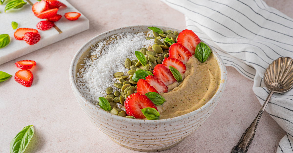 A refreshing, nutrient-packed meal that’s as beautiful as it is beneficial. This vibrant smoothie bowl is a powerhouse of antioxidants from strawberries, bananas, and zucchini—perfect for protecting cells from free radical damage and supporting long-term health. With avocado, zucchini, and pumpkin seeds, it also delivers a hearty dose of fiber to support digestion and balanced blood sugar. Plus, added protein from protein powder and seeds helps build and repair tissues while keeping you feeling satisfied.